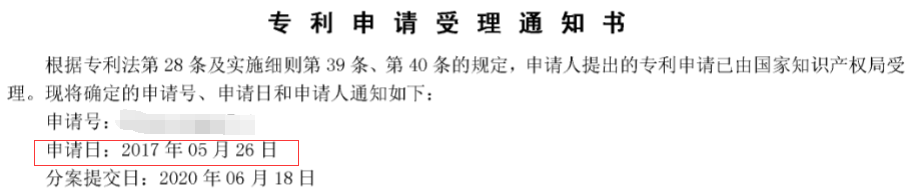举例:分案申请的案子,专利申请受理通知书上会有2个时间,一个为申请日(即原案申请日),一个为分案提交日,而此时实审期限需按申请日来算。